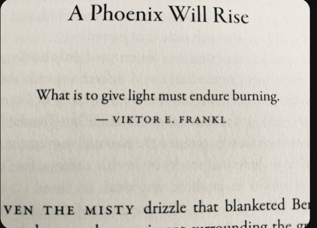This is a poem out of a book I came across. After discovering it I got a Phoenix tattoo. Every time I look at it, I am reminded that every single thing that produces light must endure burning: A light bulb, the sun, fire, and of course us amongst the living who produce light in peoples lives.It is a reminder that it is okay to burn in order to be a light.